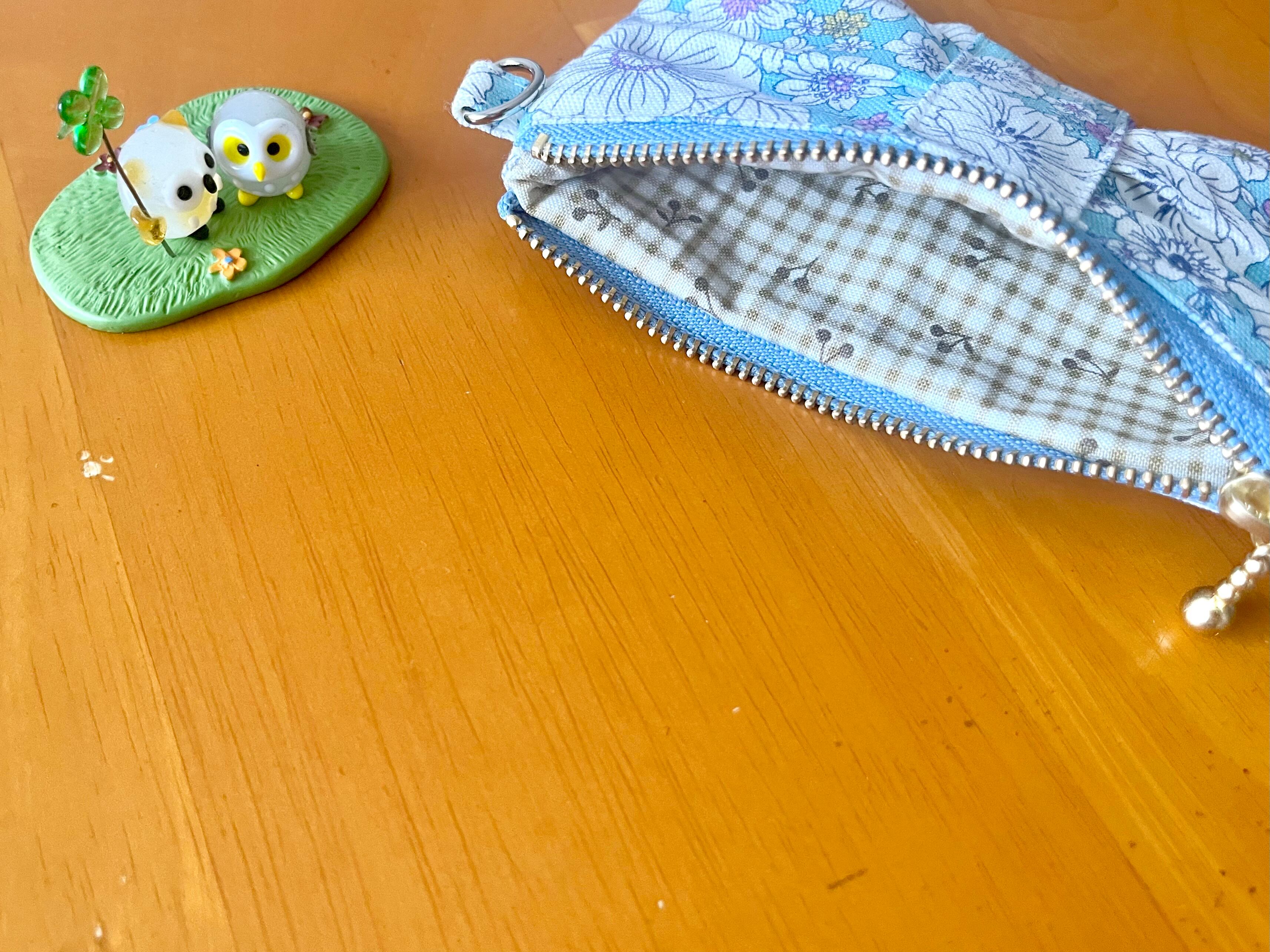 やさしい花柄とリボンのかたちが可愛い、手のひらサイズのポーチです。