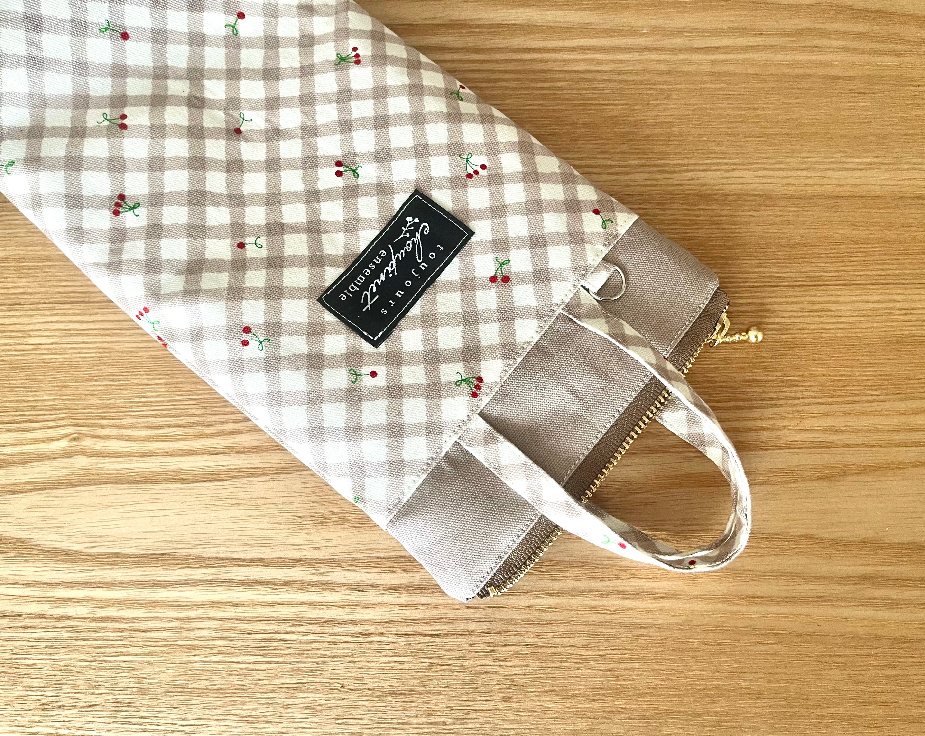 (くすみ系モカベージュチェック柄と無地の組み合わせ。チェック柄のところどころにさくらんぼ柄がプリントされています)